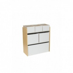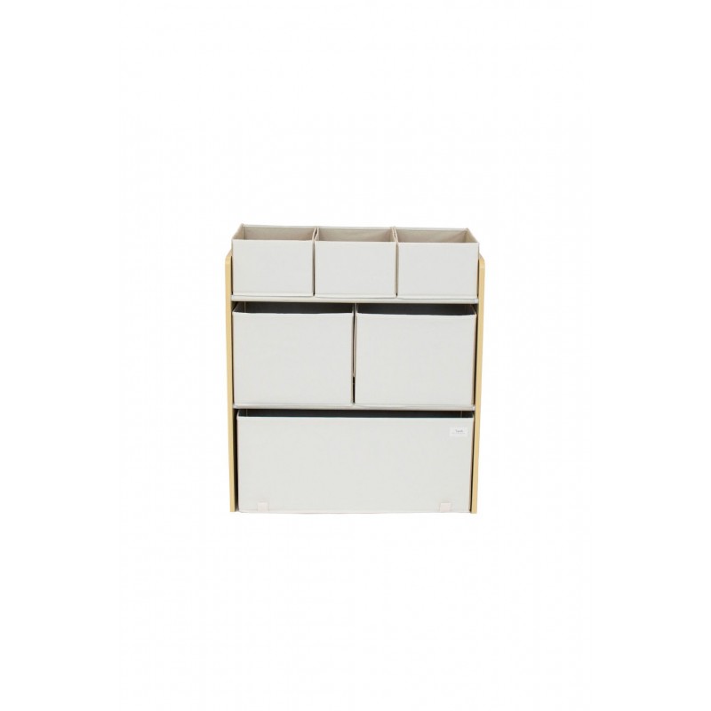 El mueble con cajas hace de organizador de juguetes, libros y materiales del cole de los niños. Está fabricado con tela reciclada y cuenta con 6 cubos de almacenamiento en diferentes tamaños para poder almacenar y organizar. Diseñado en altura perfecta para el tamaño de un niño, le permite ver y seleccionar claramente sus juguetes favoritos y le facilita la limpieza cuando termina de jugar Fácil de montar con un marco de madera para mayor estabilidad. Tejido 100% poliéster reciclado. Cubos incluidas: 3 pequeñas, 2 medianas y 1 grande No apto para niños menores de 3 años. Dimensiones: 70cm alto x 62cm largo x 27,90cm profundidad