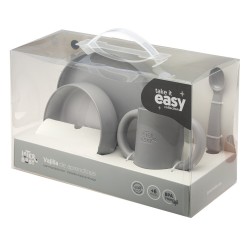 La vajilla de aprendizaje en color gris petróleo de Interbaby es un conjunto de utensilios diseñados específicamente para ayudar a los bebés y niños pequeños a aprender a comer de forma independiente. Esta vajilla está especialmente adaptada para fomentar el desarrollo de habilidades motoras, coordinación mano-ojo y autonomía durante las comidas.