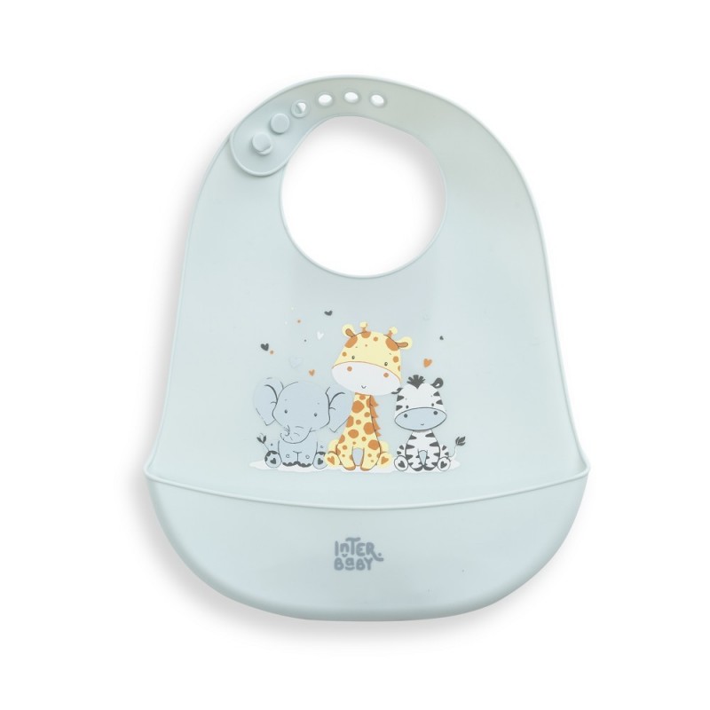 Babero de silicona estampado modelo Tres Amigos en azul grisáceo. Resistente, fácil de limpiar y perfecto para mantener la ropa del bebé limpia durante las comidas.