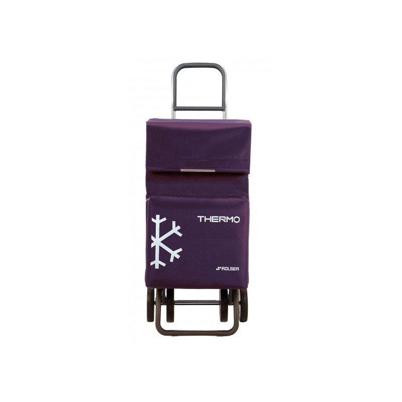 Carro de aluminio de 4 ruedas. Para evitar cargas innecesarias. Base inferior abatible. Bolsa con bolsillo térmico, armazón interior plegable y bolsillo trasero con cremallera.