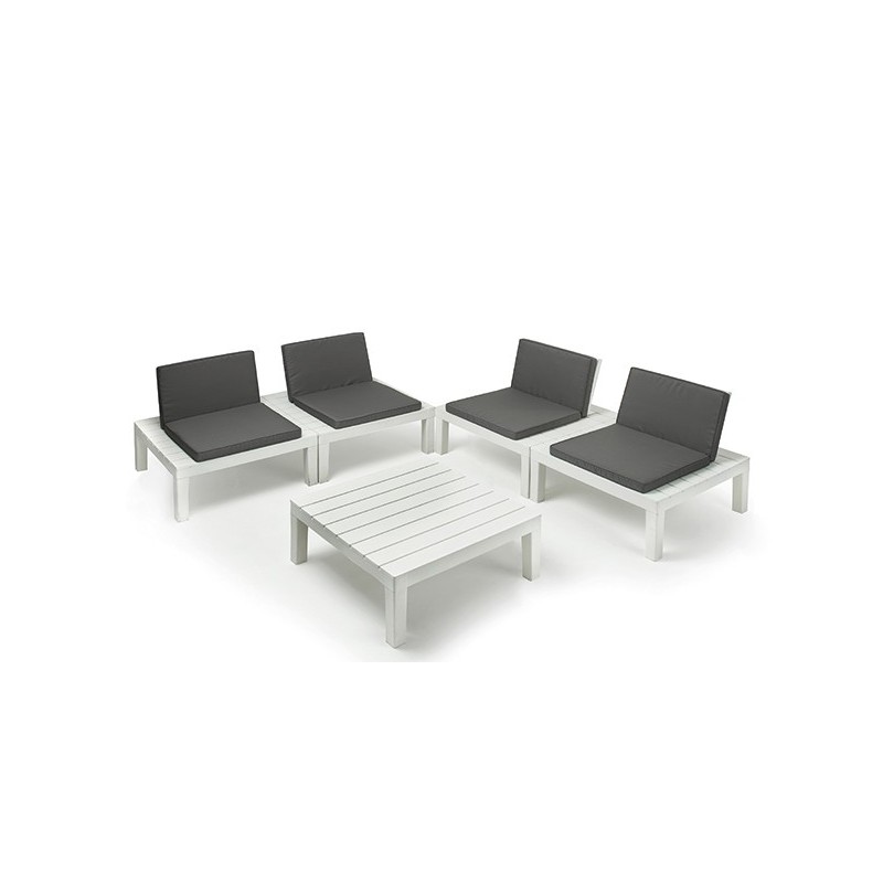 Compuesto por 4 módulos de asiento con respaldo de 78x78x70 cm. y un módulo auxiliar de 78x78x32 cm.