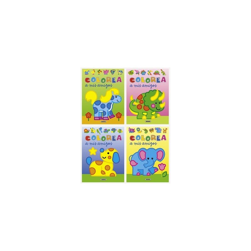 Una simpática colección de libros de colorear para los más pequeños, con divertidos dibujos de trazo grueso y colores básicos. Perros, gatos, conejos, dinosaurios, elefantes, loros..., los animales más conocidos y queridos para que los niños disfruten coloreando. Precio ejemplar1.95 € Lote de 4 ejemplares Referencia: S0386999 Colección: Colorea a mis amigos Encuadernación: Cartulina plastificada con estampación plata ISBN: 9788467701807 Tamaño: 20 x 27 Páginas: 12 Idioma: Castellano Edad: 3