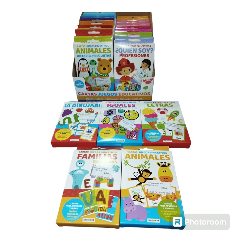 El juego de cartas educativo que se muestra en la imagen incluye una variedad de opciones diseñadas para ayudar a los niños a aprender y desarrollar diferentes habilidades. Cada paquete parece estar enfocado en un tema específico, como "Animales", "Letras", "Profesiones", "Iguales" y "Familias de Letras". Estos juegos están organizados en cajas coloridas y visualmente atractivas, con imágenes y gráficos que son fáciles de entender para los niños. El propósito principal de estos juegos es educativo, ayudando a los niños a aprender conceptos básicos como el reconocimiento de letras, la identificación de animales, y el aprendizaje de las profesiones, todo a través de juegos interactivos y actividades que fomentan el aprendizaje de una manera lúdica y entretenida. Cada juego incluye cartas que contienen imágenes, letras o palabras, y están diseñadas para ser utilizadas en diferentes tipos de actividades educativas.