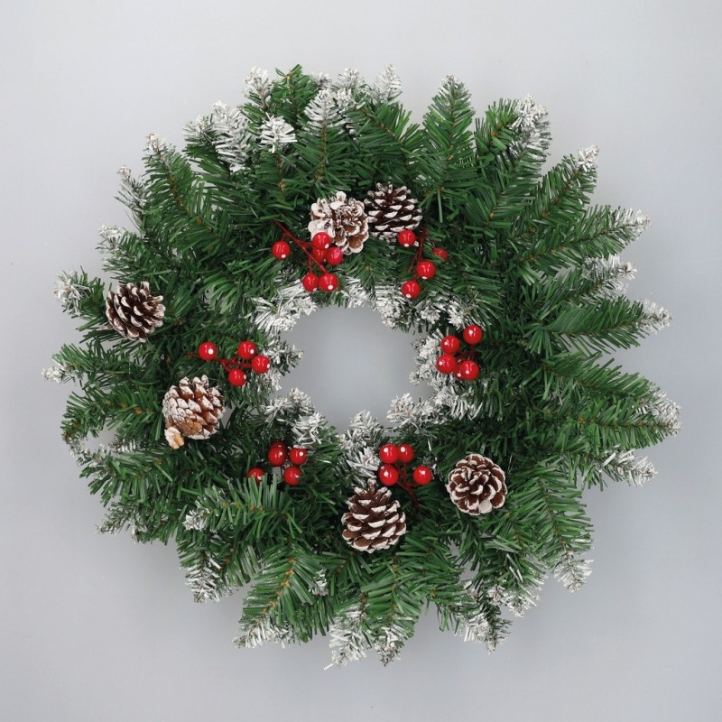Corona de navidad efecto nieve con acebo y piñas Baliti Ø50cm 80 ramas