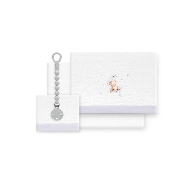Triptico Cuna Coralina Estampado Oso Luna Estrellas + Broche Bco/Gris