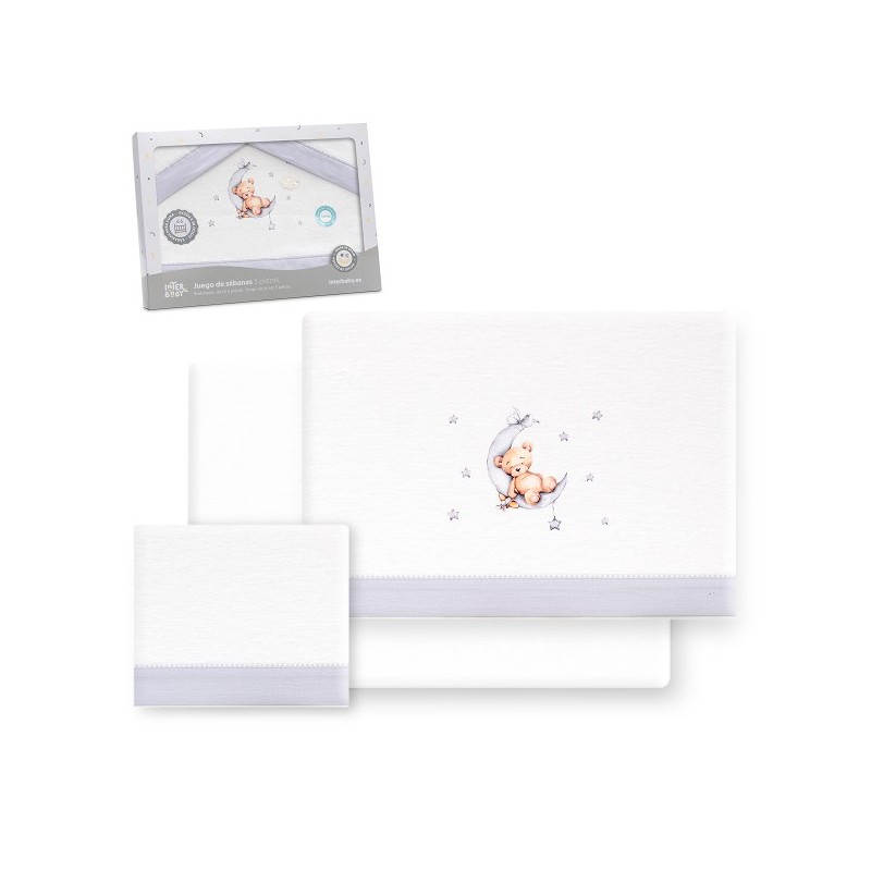 Este set incluye sábana encimera, sábana bajera ajustable y funda de almohada, todo coordinado con un delicado diseño de un tierno osito rodeado de estrellas en tonos blanco y gris. Su estilo neutro combina perfectamente con cualquier decoración de cuna o habitación infantil.