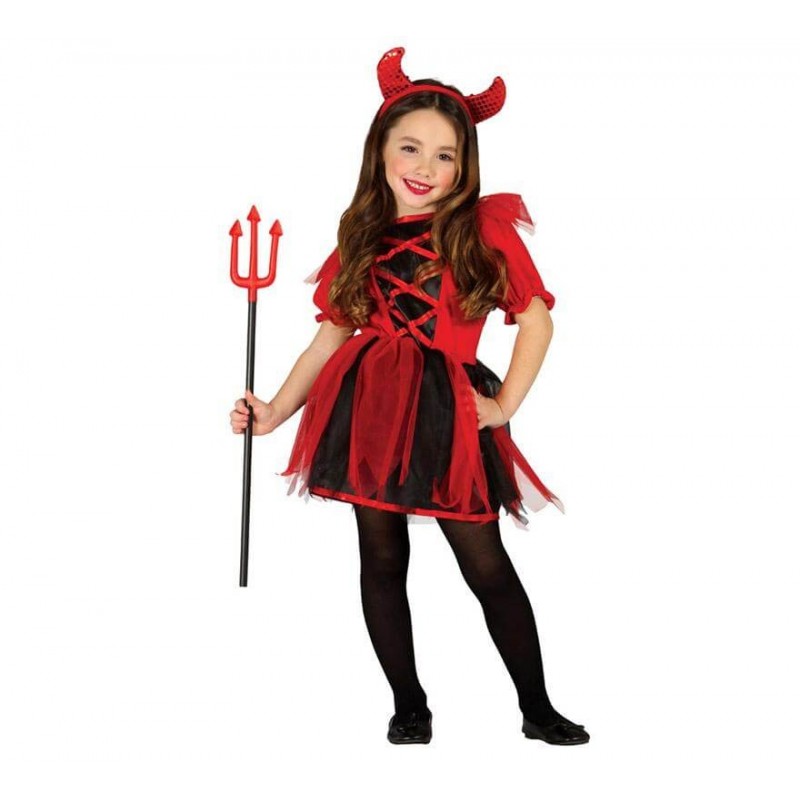 Disfraz para niñas de Diablesa o Demonia rojo y negro en varias tallas. Incluye diadema y vestido. Tridente, medias y zapatos NO incluidos