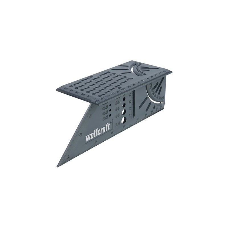 Escuadra hecha en plástico de alta calidad y con una amplia gama de usos gracias a su regla y escala angulares, con tope para ángulos de 45º y 90º y un transportador de ángulos entre 0-90º. Usos: – Proporciona un indicador para líneas paralelas. – Permite saber rápidamente el diámetro de una broca gracias al calibrador de diámetros. – Como herramienta de marcado, permite tomar medidas fácilmente y transferirlas a vigas y piezas de trabajo tridimensionales. – Es posible realizar marcas precisas alrededor de las esquinas, debido a su geometría rectangular, siendo ideal para transferir ángulos de inglete a los dos lados de la pieza de trabajo.