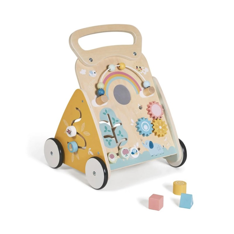 Andador para bebé Mimo de madera con diseño estable y seguro. Incluye juguetes interactivos, puzles y xilófono que estimulan el aprendizaje. Ruedas antideslizantes, bordes redondeados y materiales sostenibles. Ideal para los primeros pasos y como regalo educativo.