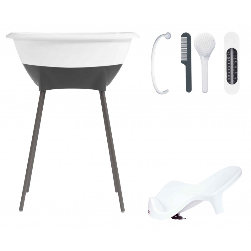 En este set de baño de LUMA podrás encontrar todo lo que necesitas para cuidar de tu recién nacido. Contiene seis artículos indispensables para el cuidado diario de tu bebé: bañera, soporte plástico con patas metálicas, asiento de baño, cepillo-peine, termómetro de baño y tubo de desagüe. 60x56x100cm.