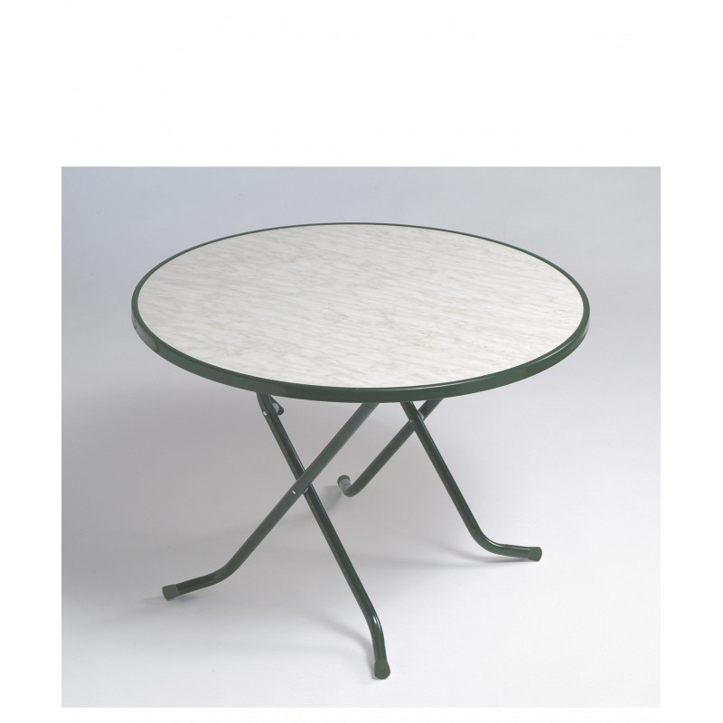Mesa acero diámetro 100cm verde mármol. Armazón de acero pintado verde. Tapa de madera recubierta de plástico imitación al marmol.