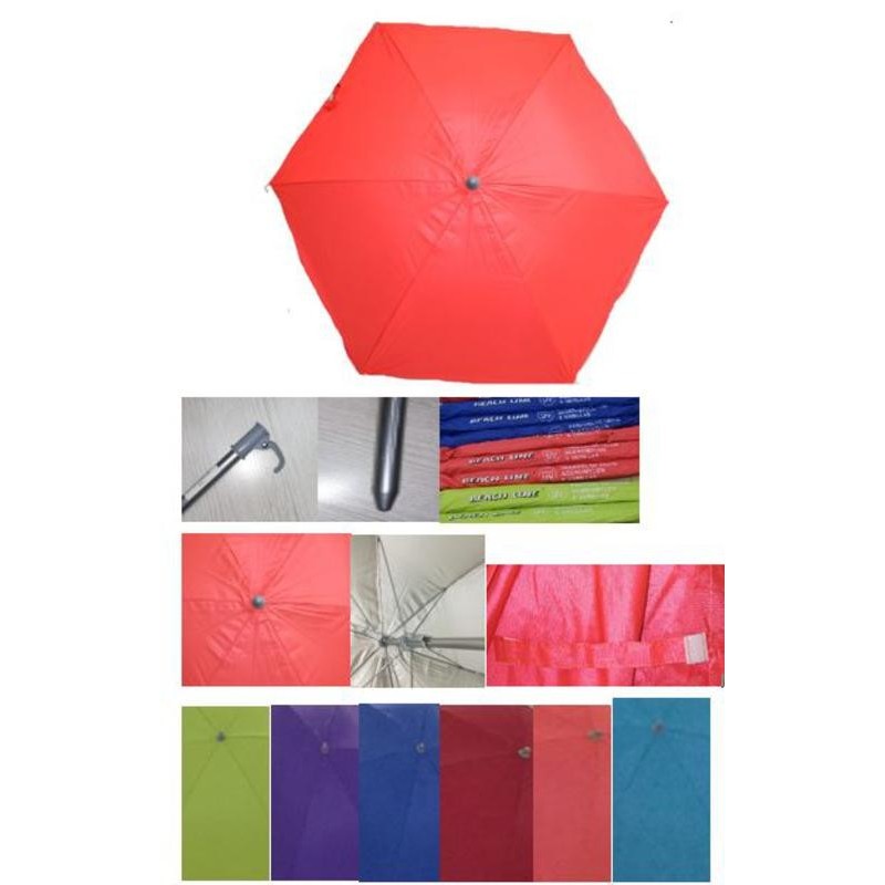 Parasol 1,40m. Nylon y tubo acero. 6 varillas. Tubo 16/19mm. Tejido aluminizado anti-UVA. Colores surtidos, se sirve según stock.