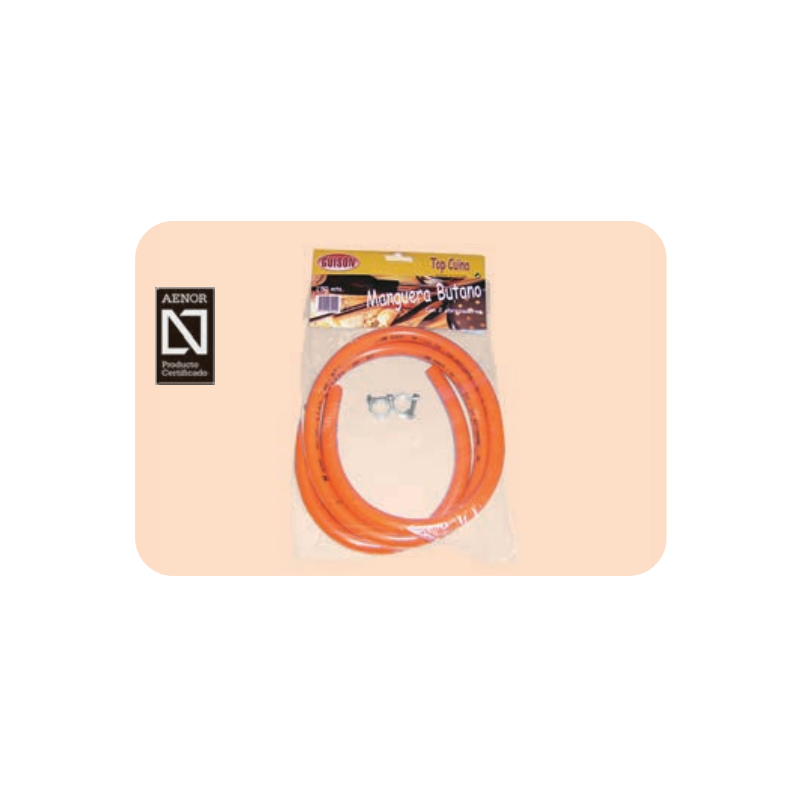Manguera de butano/propano con abrazaderas robustas para una conexión segura. Material duradero, ideal para uso doméstico y profesional. Fácil instalación y versatilidad garantizadas. Calidad Paelleras El Cid.