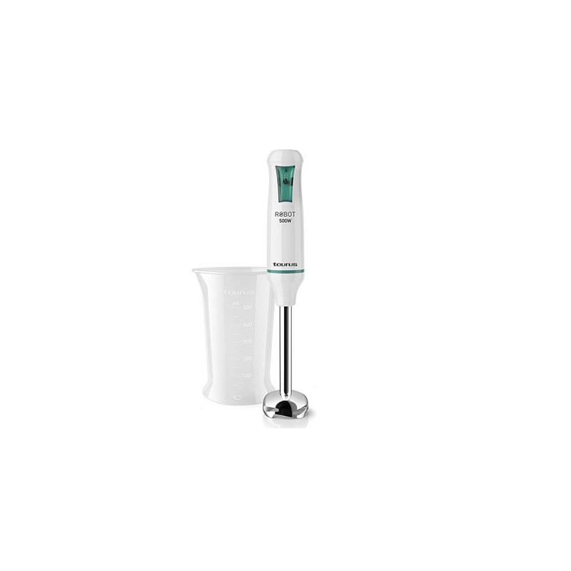 Potencia: 500 W. Turbo Rotation System. Pie con cierre bayoneta, desmontable. Cuchillas de alto rendimiento en acero inox. Sistema anti-salpicaduras. Accesorio: vaso medidor.