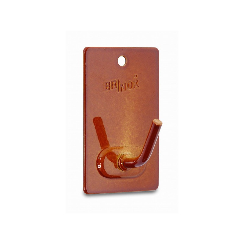 Percha con base de acero inoxidable o acero lacado de 0,8 mm de espesor. Incluye adhesivo de alta calidad y un orificio para agarre con tornillo en superficies porosas o con poca adherencia. Tamaño: 26 x 43 mm. Color: marrón porcelana. Ideal para una fijación segura y duradera en cualquier espacio.