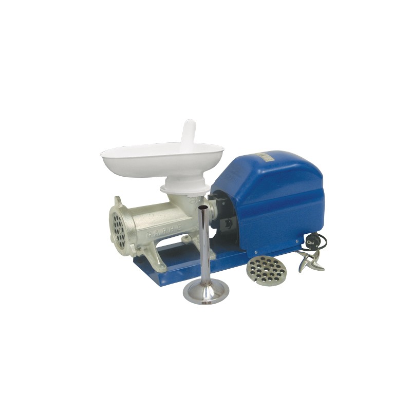 Picadora embutidora eléctrica Nº32 sobre base metálica, con cabezal tradicional de boca ovalada extra ancha, equipada con una tolva especial que mantiene este ancho a la vez que garantiza una seguridad total.