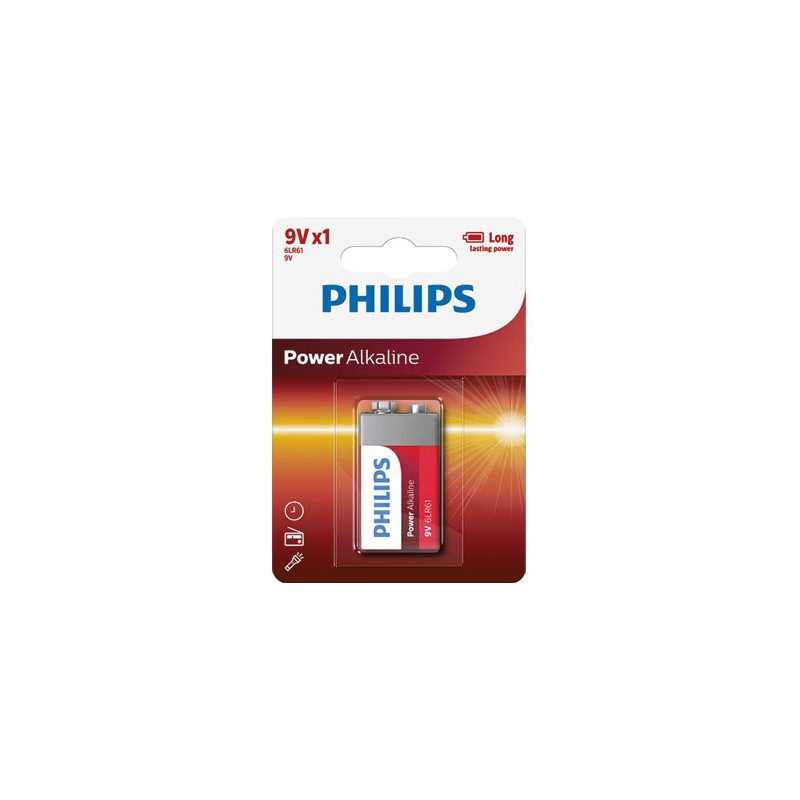 Pila Philips 9V alcalina de alto rendimiento. Ideal para detectores de humo, micrófonos y dispositivos electrónicos. Blíster de 1 unidad.