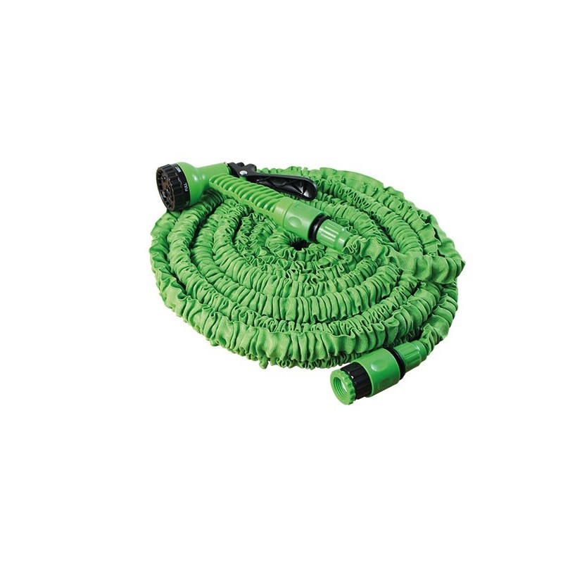 Fácil de guardar, ligera, se expande y se drena automáticamente en pocos segundos. Se extiende hasta 3 veces su longitud original. Pistola rociadora con 7 configuraciones. Conector rápido universal que se acopla fácilmente a su grifo de jardín. Ideal para patios y jardines.