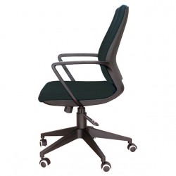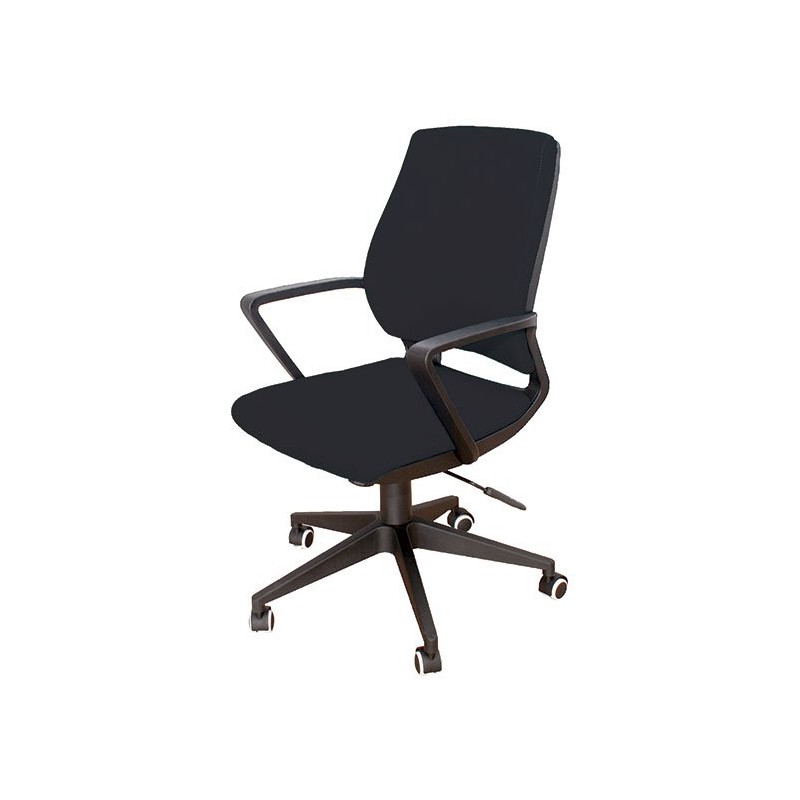 Silla de oficina giratoria. Respaldo y asiento acolchados. Asiento ajustable en altura (10 cm). Brazos en polipropileno de alta resistencia. Base de 5 radios con ruedas. Dimensiones (anchura x altura x profundidad): 62 x 96-106 x 59 cm. Color: negro.