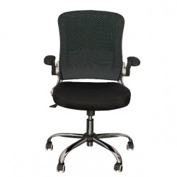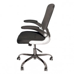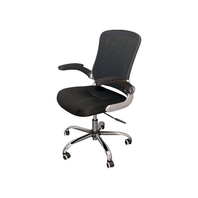 Silla con respaldo de malla azul con marco de polipropileno negro. Asiento acolchado y ajuste en altura (8 cm): entre 97 y 105 cm. Regulación en inclinación. Asiento acolchado. Brazos abatibles. Base cromada de cinco radios con ruedas. Dimensiones (anchura x altura x profundidad): 66 x 97-105 x 62 cm.