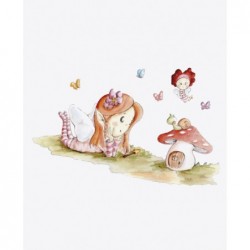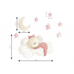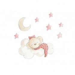 Vinilo con dibujo en acuarela pintado a mano de osito infantil con pijama rosa durmiendo sobre nube. Reproducido y recortado en autoadhesivo de alta calidad, material laminado y de fácil colocación. Impreso en tintas látex no tóxicas de alta resistencia, con acabado mate. Realizado en España. Asegurar que la superficie esté completamente limpia y seca antes de colocar el vinilo. Medidas especificadas en la imágen de la columna IMAG 2.